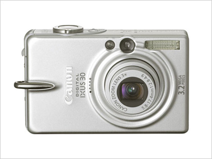 如果你认为轻薄时尚的机器价格都很贵,那柯尼卡美能达DiMAGE X31就得给你好好上一课了。金属质感外壳,25mm的超薄机身,还有潜望镜式3倍光学变焦,除了没有大屏幕LCD,看似和最近比较活跃的索尼T系列相差不多,而付出的代价仅仅是一半的银两。那么性能如何呢?当然得对得起你的银子啊!300万象素CCD记录校园生活足够了,1.5英寸的LCD还满清晰的。开机时间只需1秒,无论广角端还是长焦端都具有10cm的微距能力,还能拍摄视频,连摄像头的工作也可以胜任,可以说一个都不少。画面色彩还算真实,不过暗部颗粒明显了些。便宜的机器配件可不能拖后腿,所以X31使用廉价的SD卡,裸露在外的存储卡插槽你可得爱护点,电力则是由2节AA电池提供,买个大容量的套装保证你用的安心。 短片之王 佳能 IXUS 30 参考价格:2250
