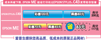 EPSON ME1 原装正品墨盒售价分别为彩色墨盒72元,黑色墨盒45元,这样便宜的耗材在目前市场上可谓是独一家,这无疑给注重成本的家庭用户吃了一颗大大的定心丸,买的起打不起的日子绝对会被廉价而优秀的EPSON ME1所终结。