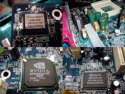 这款主板的最大卖点就是整和了相单于GFMX440显示效果的显卡并且价格仅卖599元,对于对显示性能没有太高要求的朋友来说,确实是一款最超值的NF2主板了。下面我们来看看它的做工和用料有没有缩水的地方。