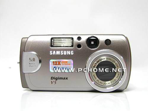 三星V5的外观还是和V3/4一样,它们的外观、按键、镜头、配件几乎完全一样,只是在一些细节方面做了改动。可以认为V5就是V3/4的500万像素升级版。三星V5的外观大气,整机采用塑料机身,具有金属质感,手感也不错。三星V5采用3倍光学变焦施奈德镜头,这也保证了其成像品质。