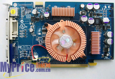 蓝色的底板设计,上面覆盖着一块硕大的纯铜散热片,覆盖住了核心部分和HIS桥接芯片,增加了散热的效果同时看上去更家美观,整块板透露着一种高贵的气息。由于传统的AGP插槽只能提供30w左右的电力这于PCI-E板70w的电力需求有很大差别,所以我们在这块板上面看到了外接的电源接口。在输出方式上采用了传统的DVI+S-Video+D-Sub,另外还有一个亮点就是这块卡采用了1.6ns的三星DDR3显存颗粒,我们知道一般的工作频率在1GHZ的显卡,只要2.0ns的显存颗粒就可以满足了,这样的奢侈做工,为这块卡的超频潜力带来很大提升。