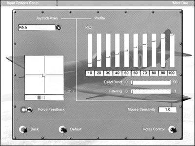 在右侧Profile区域是舵面响应曲线调整区,通过选择轴向,可以分别对摇杆的三个轴进行设置(这个参数设置比较复杂,由于篇幅限制我们无法详述,大家找一些资料仔细研究一下);它的下方还有两个参数设置,Dead Band设置无响应区,可以让程序忽略摇杆中部一小片区域的信号,如果自己摇杆居中的时候会自己输出一些杂信号微微跳动,可以将这个值设得大一些(质量差和使用时间长的摇杆要设大一些)。另外一个参数就是Filtering杂讯过滤,其作用就是在你剧烈操纵摇杆的时候,程序自动加一个缓冲,飞机控制会慢一些柔和一些。新摇杆可以设定为零。