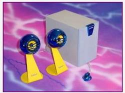 R121T的外形显得比较另类,可以说是漫步者的一种创新。卫星音箱外壳由一个圆形塑料箱体以及一个金属底座构成。整个卫星单元无论是拿在手上、还是放在桌面上都有一定的份量。卫星喇叭是一个2英寸口径的纸盆单元,属于全频带型,负责中高音的回放。两个卫星单元在出厂的时候就已经被一条信号线连接在一起,并带有信号接收插头。