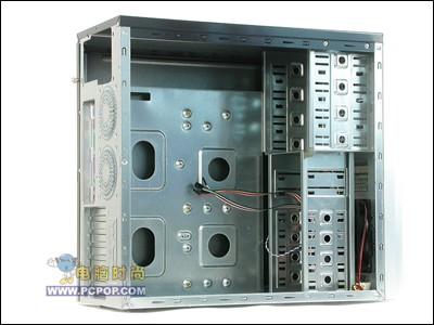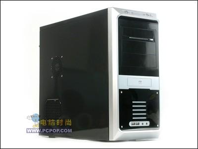 从正前方看去,似乎这款机箱要比一般的机箱宽大一些,这也是新思路为了加强机箱内部空气流动所做出的一点改进,三个光驱位加一个软驱位的扩展能力也足够一般用户的需要。上面第一个还作了光驱舱门设计,保持了整体颜色风格的统一。前置I/O面板安置在了机箱最下端,提供了USB2.0×2以及一组音频接口。