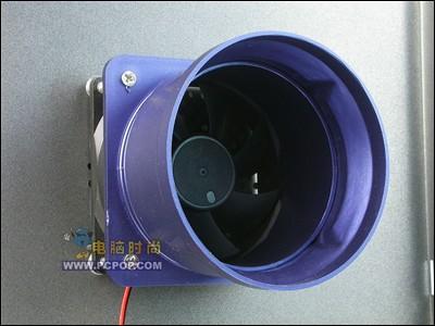 侧板的另外一面,不仅有风扇,在风扇的上面还安置了一个口径非常大的导风罩,虽然没有采用两段式设计,但是由于其是安装在风扇上,因此无形中减少了与处理器的距离,达到更好的散热效果。