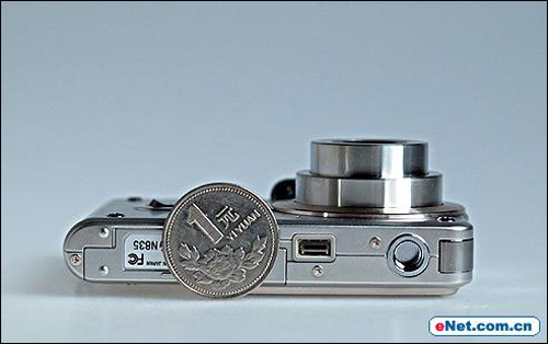 S100的超薄体格正是来自于它身上的陶瓷镜头,这种镜头不仅具备非常好的聚焦性,更重要的是透明陶瓷镜片具有良好的延展性,能做到非常地轻薄小巧,因此S100的通体尺寸为88(宽) x 57(高) x 16.7(厚) mm,这个尺寸不包括凸起部分,其中机身最薄处仅为为14.2mm,重113克,尽管在厚度方面比Z55差不多少了1/3,但S100的机身重量依然与EX-Z55相同,这是因为S100采用的是特殊工艺处理的不锈钢表面,金属质感非常强烈。