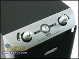 低音炮的设计显得比较可爱,旋钮的设计在低音炮的上方,看上去就像是个长着触角的外星人。这样的设计显然并不只是为了个性和美观,而是更大的方便了用户的调节,试想一下如果低音炮放在桌子下面我们就不用费力弯下腰调节了。调节旋钮一共3个,分别是低音、音量和电源开关。打开面罩后,看到低音炮的前置气孔,这样设计好处是我们可以把低音炮更贴近墙壁摆放以便节省空间,而不会影响音质。