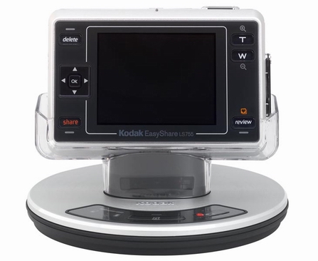 柯达的LS755的外观设计具有其独特的特色。首先是其独特的充电底座,可以把相机支撑起来当成一个电子相册,并提供一键上传照片的功能。LS755具有500万像素的CCD,3倍光学变焦施耐德镜头,背面硕大的2.5英寸室内室外液晶显示屏与机身背面结合得非常优秀。同时,LS755也非常注重相机的易用性方面,机身内置多种情境模式可供选择,也有功能强大的相册分享功能,菜单界面友好,对于要求品位和易用性的商务朋友来说,是再合适不过的了。