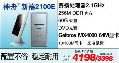 如果您手里只有4000块的预算,又想要一个性价比颇高的台式的话,那么神舟新禧2100E配15''液晶是个不错的选择。它主要采用了赛扬2.1G处理器,搭配上256M内存,60G硬盘和DVD光驱,完全可以胜任用户的文档处理,家庭娱乐等的要求,是办公和家庭用户非常适合的选择。这款机子的最大亮点就是采用了Geforce MX4000 64M的独立显卡,使图形的表现力更强,画面逼真流畅,玩游戏也完全没有停滞的感觉。
