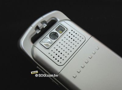 MP100 环状天线背后,设计了吊饰孔,洞还挺大,蛮好挂上吊饰的。手机背部上方,则设计了镜头、闪光灯以及自拍小镜,此外,还有双声道的立体喇叭,奏出响亮的乐声。