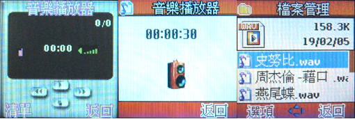 MP100 可以直接由快速键进入 MP3,按下之后会出现上图左边的「音乐播放器」界面,使用者可以从清单中选择歌曲。上图中间则是,当音乐储存在 miniSD 卡中的档案「资料夹」里,手机就直接作单曲的播放,不会出现播放界面。上图右边则是由档案管理资料夹中,找寻歌曲的状态。