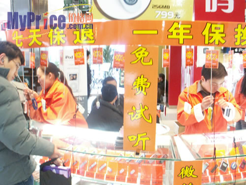 随着气温的升高,数码市场似乎也随之升温了。鼎好电子商城里人来人往,可能是最近学生开学,而他们是MP3最疯狂的追随者,所以在商城里,可以看到许多学生味十足的年轻人再挑选MP3,商家的促销活动也搞的热火朝天。