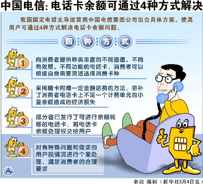据中国电信有关负责人介绍,这4种方式分别为:中国电信向消费者提供种类丰富的不同面值、不同有效期、不同功能的电话卡,消费者可以根据自身需要灵活选择消费卡种;采用随卡附赠一定金额话费的方法,弥补了消费者电话卡上不足一个计费单元的少量余额造成的经济损失;部分省已发行了可进行余额转移的电话卡,将电话卡余额处理权交给用户;对有特殊问题和需求的用户视情况进行个案处理,满足消费者的合理要求。