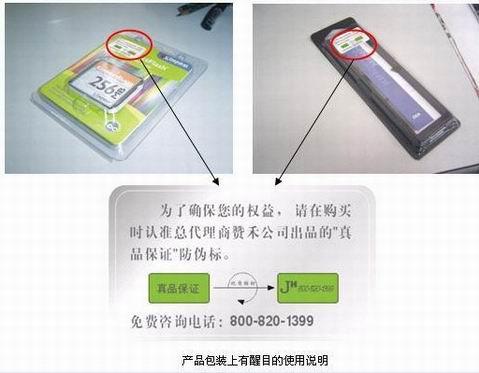 购买硬件产品时,首先第一就是看产品包装,以金士顿(Kingston)内存为例,2005年1月10日起,在国内经销的金士顿产品,一律采用全新的"纳米折光"防伪标,据说这种类似激光技术的防伪标绝无造假的可能,这种防伪贴将取代使用两年之久的电话短信仿伪标贴,以后正品的金士顿内存在醒目的位置都能看到,并且无需通过第三方手段比如电话、短信等去验证真伪。
