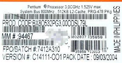 我们看看这颗P4 3.0G盒包CPU,在产品包装盒的标签中,标明的二级缓存为512K,这是完全正确的,但打开包装,看CPU的表面时,上面标识二级缓存却是1M。而地球人都知道,P4 3.0GC(FSB800)的二级缓存仅为512K,由此,我们可以断定这是一颗仿冒的盒包CPU。