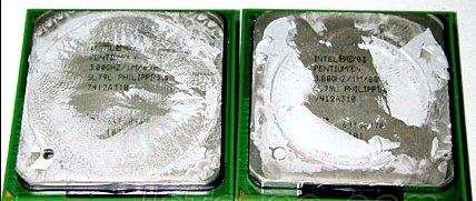 再以AMD XP2500+为例,其实假冒XP 2500+就是Thorton核心的2000+打磨而来,其核心与Baton 2500+相同,只不过二级缓存被关闭了一半,为256KB。原始的假冒方法是通过铅笔或银漆连通CPU表面的L2金桥后打开另外的256KB缓存,这样一块售价仅400余元的Thorton核心XP2000+摇身一变成了价值700多元的XP Barton2500+,JS就此谋取近200元的暴利。此外,假XP 2500+由于在L2金桥上动了手脚,所以一般情况下JS用易碎签把这个关键地方盖的严严实实。