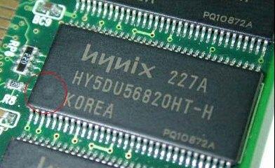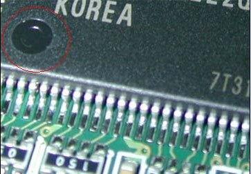 但只要你仔细看,内存颗粒角上独有的一个圆型凹坑。没有打磨过的颗粒,凹坑是发亮的,颗粒表面是磨沙的感觉,如下图所示。