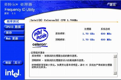 如果是INTEL处理器,可以使用INTEL针对自己开发的工具Processor Frequency ID Utility,它采用一种频率确定算法来检查处理器中的内部数据,并将此数据与检测到的操作频率进行比较,最终会将系统总体状态作为比较结果通知用户。运行Processor Frequency ID Utility出现其主界面,从这里可以看到,该CPU为INTEL 赛扬四1.7G,系统总线频率为400Mhz;而“CPUID数据”中是显示CPU详细参数,如处理器特性、高速缓存信息等。
