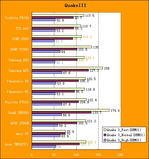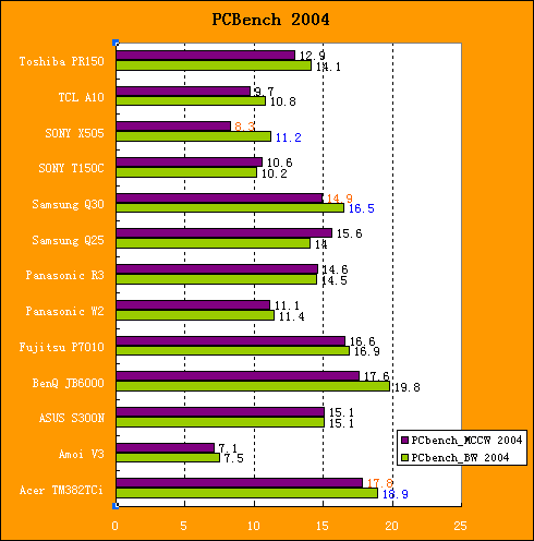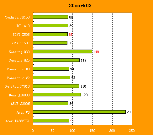 在3D功能方面,因为多数采用的是Intel 855GM/GME集成的显卡,所以表现相差不是很明显,而只有Amoi V3因为采用的是ATI M9200独立显卡,在3D方面就更为突出。其它分855GM与855GME分别在90分与110分的平均水平上下。