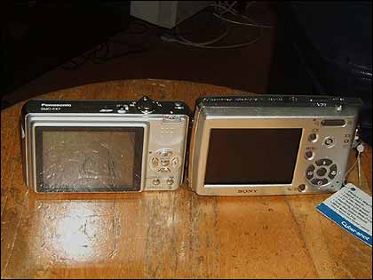 在机身背面,两者最为明显的特征都是采用了2.5英寸规格的LCD显示屏,这在家用时尚数码相机市场上无疑具有极大的诱惑力。在分辨率方面,FX7采用11.4万像素,T33采用23万像素,实际使用来看,索尼的显示效果要清晰得多,特别是在光线较暗的环境下,FX7的LCD往往会出现较为明显的颗粒。在色彩表现方面,FX7比较忠实,和实际景物的色彩差别比较小,而T33的LCD显示得比较艳丽。需要注意的是FX7的LCD采用了硬玻璃覆面,可以有效防止LCD因受到各种撞击而损坏的情况,而T33的LCD则是裸露在外面,个人感觉使用起来还得小心翼翼的。