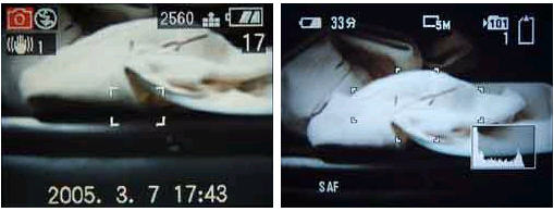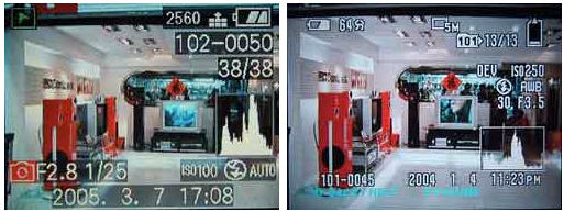 上面我们可以看到两者在拍摄模式下的界面显示有相同的,也有一些差别的。共同的地方是都显示电池状态,影像分辨率、存储卡可拍摄张数,曝光直方图等。不同的是,FX7可以一直显示拍摄模式,闪光灯模式以及防抖动模式等,而T33可以一直显示电池的详细剩余时间,对焦模式等。从实用性来看,笔者觉得两者相差不大,都比较人性化。