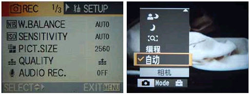 需要注意的是两者都具有中文菜单选择。就菜单显示来看,两者采用了刚好相反的菜单排列方式,FX7采用纵向选择不同的功能,而T33则采用横向选择。不过笔者觉得习惯使用某款机型以后,两者的差别就不存在了。