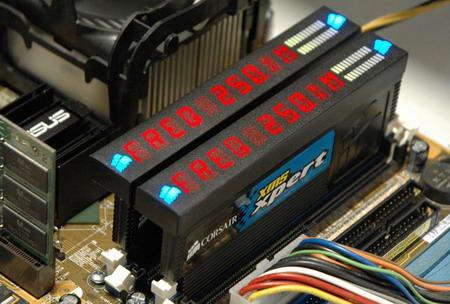 XPERT区别于其它平庸内存的一个显著特点就是,它拥有一个可同时显示10个字母的LED显示屏,位于内存条最上方容易看到的位置。安装之后,XPERT可以自动显示内存的速度、电压和DIMM温度等数据,明亮的红色字符非常醒目。两边分别有一个冷蓝色的灯,看起来赏心悦目。右边采用流行的流量表示方式,内存负荷一目了然。