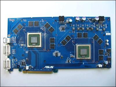 同其他类似的解决方案一样,华硕把两块显示核心放到了一块PCB板上,这两个核心通过NVIDIA的SLi接口(MIO Port)进行通讯。