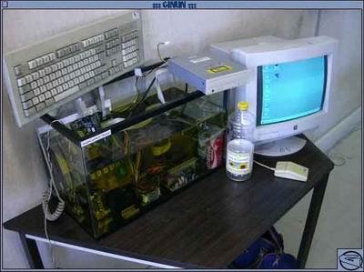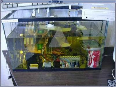 我们先来看一下图片,猛得一看,是不是电脑放在鱼缸里?里面有一种未知名液体,强吧!不要认为这台电脑是个噱头,不能工作,这是一种新型的散热方式!其散热的性能相当出色!这也就是我们要说的“甘油制冷法”。下面小编讲一下其制冷的原理,由于没有找到相应的资料,小编只好“道听途说”了……