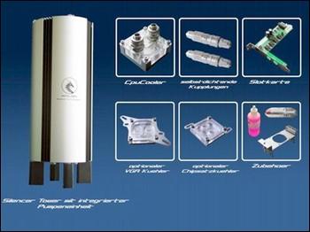 图为:这款水柱型散热器的所有配件,包括水冷头等等
