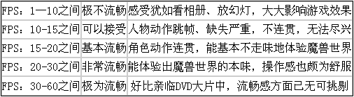 当然,这只是魔兽为安慰玩家的底线配置。比如GEFORCE2是无法很好的支持DIRECTX 9.0的。在CPU的要求上,笔者认为不会太高,因为现在系统对CPU的要求已经逐渐达到了一种饱和的状态。而显卡对游戏的影响才是致命的。其对FPS的影响是最大的。在FPS的要求中,以下是一组经验数据: