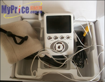 盒内配件比较丰富,除了AV1000本身外,还有一副立体声耳机,USB传输线,视频信号线,说明书,三包卡,软件光盘,电源适配器,外挂硬盘,另外还有一条饰带和一个保护套。