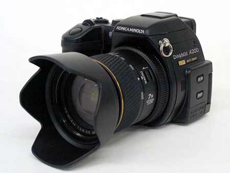 柯尼卡美能达DiMAGE A200的定位是A2的后继机种,简化了一些功能、接口,简化的部份包括了3D对焦、机顶讯息液晶屏幕、可垂直拉起的Super Fine 92万象素EVF、全时对焦感应手把、眼感应器、电池手柄的扩充性、双转轮操作,以及外接式同步闪灯插槽。A2机身左侧的功能转盘和画质调整功能也被取消。