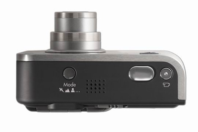 从外观不难看出R707是一款时尚机型,比较小巧,体积是98.5 x 60.0 x 35.3 mm,空机仅为180克。正面采用不锈钢外壳,表面通过金属拉丝处理,显得了R707结实稳重,而且简洁美观。特别的手握部分在不影响机器外观的同时,增加了机器的握持手感,即便是单手也能持稳相机。左上角的hp标志非常精致,为机器增色不少。镜头顶部从左到右分别是麦克风、光学取景器和自动辅助对焦辅助灯。