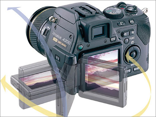 上面介绍的机款数码相机在造型上其实都算是比较异类了,还有一些“正统”的数码相机采用了旋转LCD,也十分方便自拍。这种旋转LCD最早出现在佳能的数码相机身上,比如佳能G5、A80、A95,后来柯尼卡美能达也使用了这样的设计方案,比如A2和A200。下面主要介绍一下柯尼卡美能达最新推出的800像素级别的机型A200,该机型也是目前最便宜的800万像素数码相机。A200还拥有1.8寸的旋转LCD,像素为13.4万,并且该LCD可以水平旋转180度,垂直旋转270度,这样自拍就完全不成问题啦。