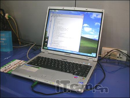 这款产品重量只有1.8Kg,可以说继承了三星本本一贯的轻、薄、时尚风格。它采用了Pentium M 730(主频1.6GHz)中央处理器,拥有2MB二级高速缓存,并配合专门为第二代迅驰芯片而开发的Intel Alviso 915芯片组,支持533MHz前端总线,配置15寸XGA TFT高亮(200流明)液晶显示屏,内置802.11b/g无线网卡,标配6 Cell锂电池,通过利用三星全新的EBL节能技术(Extended Battery Life),能够提供长达6小时的续航时间。配置的COMBO驱动器以及60GB的大容量硬盘使得本本的优势增加了许多。遗憾的是256MB内存,这和其他采用512MB内存的SONOMA本本相比略显逊色。它支持533MHz前端总线,支持DDR2,这也正是SONOMA平台的技术特性。另外我们也可以从上面的图片看出这款本本采用了INTEL的集成显卡。