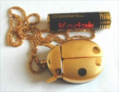 漂亮!这是小编看到它之后的第一感觉。倒不是因为它甲壳虫般的造型有多么好,而是胸前挂个“黄灿灿”的东西,感觉是非常爽D。即便他不是真金打造,来个纯铜也是不错的,那份量,可不比金子轻^_^。不过,这个造型优美,做工精细的项坠和电脑又能扯上关系呢?怎么看也不像是电脑产品啊,你说是MP3吧,可每看到耳机插孔在哪儿,你说是U盘吧,可没见着USB接口在哪?那它到底是啥捏?朋友们,猜吧……