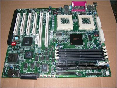 这是经典的超微(Supermicro)370DL3主板,使用ServerWorks Serverset III LE芯片组,支持铜矿核心的Pentium3处理器,板载intel I82559 10/100Mbps以太网卡、Adaptec AIC-7892 Ultra160 单通道SCSI控制器,最大支持4GB的registered ECC SDRAM PC100/133 168pin内存,主板还提供1个2个64-bit 66MHz PCI槽和一个ISA槽。370DL3的唯一遗憾是不支持图拉丁核心的Pentium3处理器。