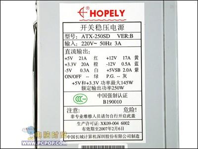 机箱所附带的电源为长城250SD电源,额定功率250W,足以满足一般用户的需要,并且这款电源已经通过了中国的3C认证(主动PFC),电源转换效率更高。