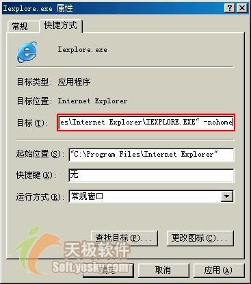 继续我们的工作,用鼠标右键单击该快捷方式,选择“属性”,会弹出“Iexplore.exe 属性”对话框,选择其中的“快捷方式”标签,然后在“目标”框里填入:"C:\Program Files\Internet Explorer\IEXPLORE.EXE" -nohome,给Iexplore.exe加上参数“-nohome”,输入时请大家注意在参数“-nohome”前面有一个空格,不要忘了,输入完毕如下图所示(图1)。点击“确定”退出即可。