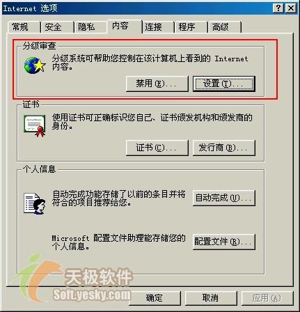 进入注册表,找到HKEY_LOCAL_MACHINE\Software\Microsoft\Windows\CurrentVersion\policies\Ratings,这里有一个名为“key”的主键,这就是您设置的分级审查口令,直接将它删除即可。重新启动之后,点击“工具”→“Internet选项”→“内容”→“分级审查”(图5),您会发现分级审查口令已经被复位了。现在您只要输入新的分级审查口令即可。