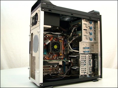 机箱的内部结构非常不错,提供了4个5.25寸位、2个3.25寸位以及5个3.25寸硬盘位,通过托架划轨及扣具这些细微方面你都可以看得到厂家的用心之处。而在机箱散热方面则前后各包含一枚12cm的SONUN风扇,并同时在机箱顶部预留了一个9cm风扇位。