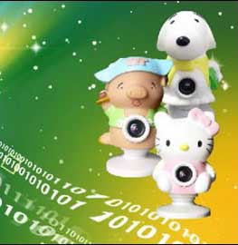 ANC公司推出的卡通人物摄像头“酷派e族”系列,包括了白色的Hello Kitty和史努比等流行的卡通造型,这些可爱造型的产品除了摄像头作用外,还可以装饰你的电脑桌面,让电脑桌更富生气。如Kitty猫外型憨厚可爱,采用进口质地材质,手感细腻,极具可爱之状,摄像头就安放在猫的肚脐部。