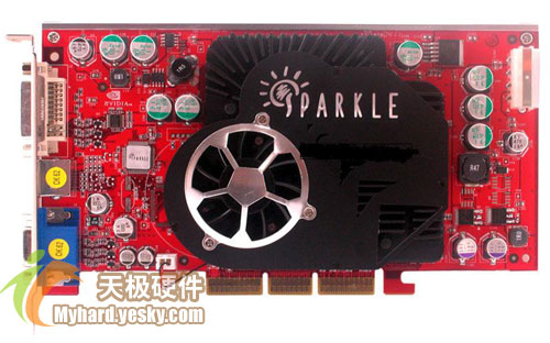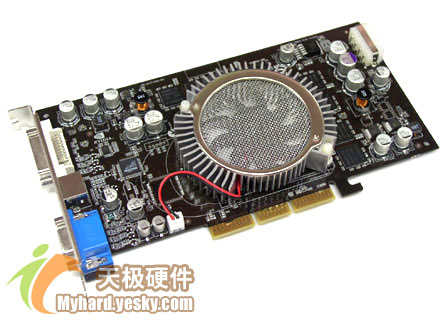 旌宇FX5900ZT采用nVIDIA P177公版设计,无论做工还是用料都相当扎实。它使用主动散热方式,依然采用旌宇独特的足球型风扇罩,散热片覆盖整个显示核芯与显存。这款显卡采用mBGA封装SAMSUNG 2.8ns显存,正面8颗,组成128M、256bit规格。默认频率为标准的核心325MHz、显存700MHz。提供了VGA、DVI、TV-OUT接口。