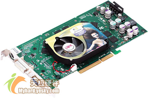 GeForce 6800LE与GeForce 6800标准版最大的区别就在于6800LE进一步缩减了像素渲染流水线的数目,从12条缩减为8条,顶点单元从5个减为4个,核心频率由325MHz降为300MHz,显存频率不变仍为700MHz。XFX讯景6800LE显卡采用P212公板设计,专业8层PCB板,板载一个4 Pin的外接电源接口,如果外接电源未接上,在使用过程中蜂鸣器将会报警。散热部分,在显示芯片上采用铝合金散热片加风扇的散热设计,显存部分并没有加盖散热片。电容全部采用的是高品质三洋铝电容,并且大面积使用OSCON固态铝电容。显卡采用的是mBGA封装现代2.8ns DDR显存颗粒,编号为HY5DU283222AF-28,规格为4M*32bit,总容量128MB,显存位宽256bit。提供了VGA、DVI-I和TV输出接口,遗憾的是没有提供对VIVO的支持。