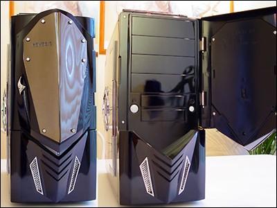 图为:这款机箱的前面板采用开门设计,并提供了充足的扩展位
