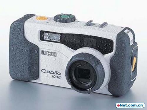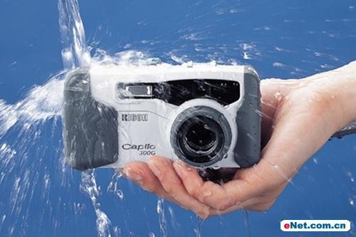 这部理光的防水数码相机在专业防水方面做得相当出色,它就是理光Caplio 300G。该相机核心移植自同系列的RR30机型,只不过在相同机身外壳上加了防水、抗尘的软质塑料机壳,并强化按键、机身缝隙的防水设计。Caplio 300G防水标准达到JIS(日本工业标准)工业7级防水(至少具备水深1米、连续操作30分钟滴水不进的能力)、6级防尘(表示该相机外壳能阻挡直径75微米以上的细沙侵扰)。Caplio 300G配置了3倍光学变焦的防水镜头,不须借助任何防水、防尘装置就能使用完整的数字摄影功能。拥有这两种能力,该相机几乎就能轻松地应付工地、沙滩、雪地、暴雨等环境下的摄影需求。