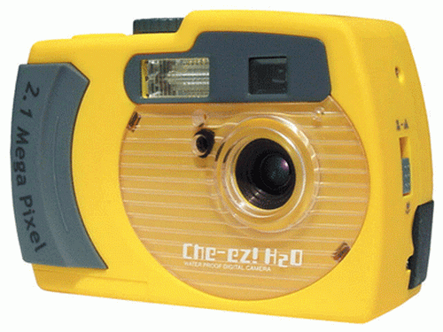 另外还有一款款就是日本NHJ公司211万像素水下拍摄用数码相机“Che-ez! H2O”,由于镜头采用了特殊结构且附带一个专用防水外壳,所以可在水下30m拍摄。该数码相机采用1/2.7寸有效像素211万的CCD传感器,图像尺寸为1,600×1,200/800×600,同时能够拍摄320×240的有声动画素材,微距拍摄为20 cm,装备1.5“的TFT彩色液晶显示屏。功能方面,“Che-ez! H2O”相机也支持白平衡调整、自拍功能等,使用内置16MB闪存,同时也能够使用SD卡、MMC卡等记忆体,最多能够连续拍摄120张照片。这款数码相机的尺寸为104×42×70 mm,重量为172g,防水外壳的尺寸为144×66×95 mm。