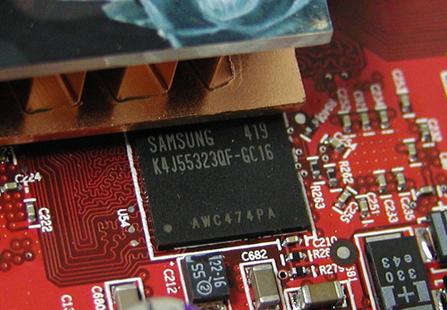 采用了目前最为快速的显存芯片之一,三星出品的1.6ns GDDR3显存K4J55323QF-GC16让X800XT PE的战斗力获得了惊人提升, 其显存频率为1120MHz,高于其标准数值。GDDR3相对于GDDR2在制造工艺上更为精密,所以其功耗和连带的热量也随之降低,所以不需要额外的散热片,也可以照样在战场上驰骋。
