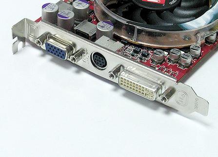 显卡的内部接口包括了一个4-pin的电源接口,由于R420芯片工艺上的领先以及内部晶体管数量较少,所以其整体功耗没NV40那么夸张。而在旁边的那个黄色的4-pin接口则是显卡进行视频采集时连接声卡的AUX-IN接口,AUX-IN为辅助设备接口,用于将电视卡,解压卡等设备的声音信号输入声卡并通过音箱播放。